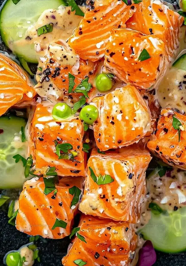 In a large mixing bowl, toss the salmon bites with these flavor-packed seasonings:Make sure each salmon bite is thoroughly coated with the spice mixture, creating a delicious flavor explosion.