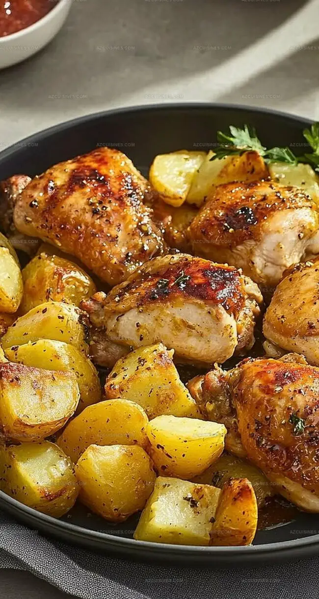 - Roast in the preheated oven for 1 to 1½ hours, monitoring the chicken’s internal temperature until it reaches 165°F and potatoes become tender and golden.