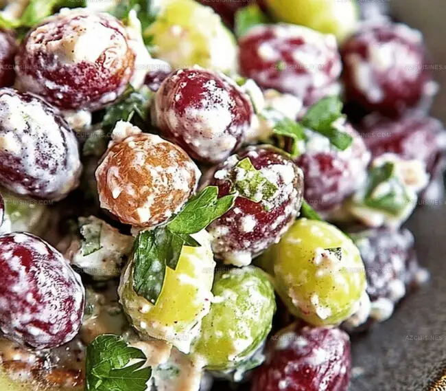 Soft grapes provide a refreshing base for the creamy dressing, creating a delightful contrast of temperatures and textures.