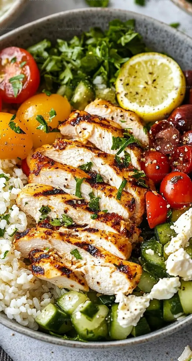 - Construct bowls by layering rice as foundation, arranging chopped vegetables, positioning sliced chicken strategically. Generously dollop tzatziki sauce, drizzle with olive oil and fresh lemon juice for enhanced Mediterranean flavor profile.