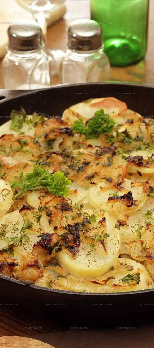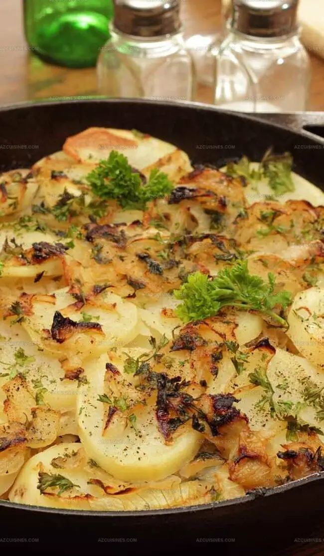 A classic French side dish originating from Lyon, featuring thinly sliced potatoes cooked with caramelized onions, herbs, and butter, known for its crispy exterior and soft interior.