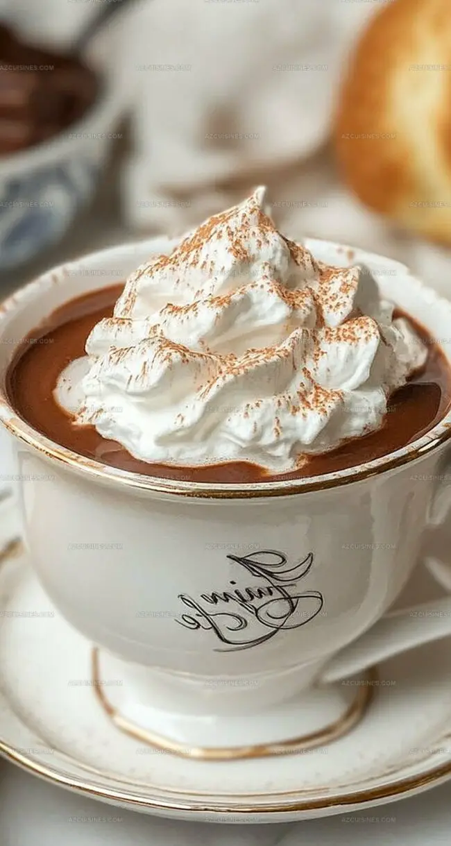 Dust the whipped cream with a light sprinkle of cocoa powder, adding an elegant and tempting finish to your Paris-inspired hot chocolate.